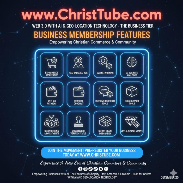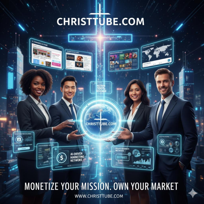 | ChristTube.com (Social Hub) | The Marketplace storefront is seamlessly integrated here, facilitating direct sales and targeted social advertising posts to followers and local communities. |