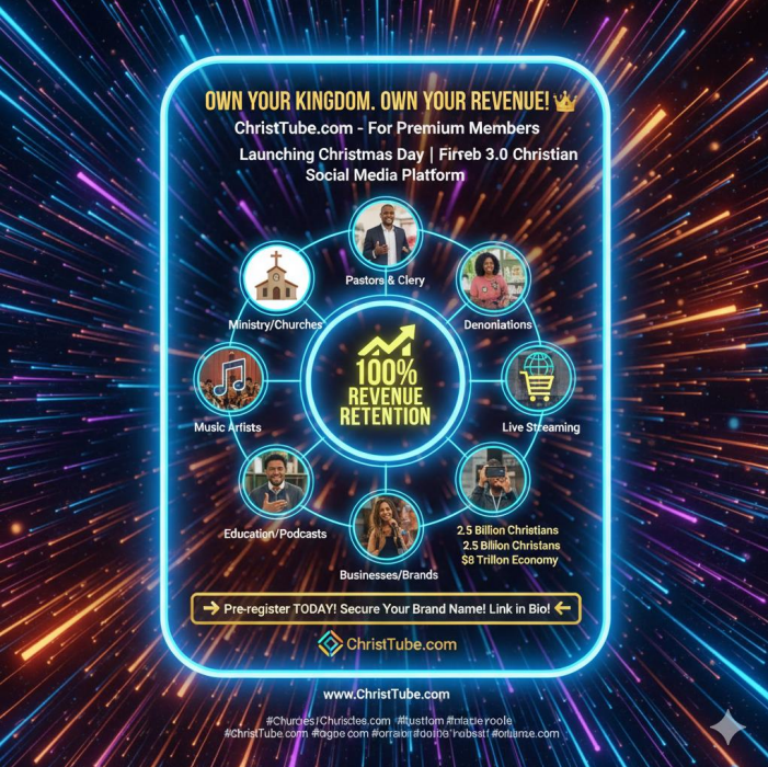 ChristTube is more than a social network—it's the first **Web 3.0 ecosystem** engineered to support and scale Christian businesses, brands, and ministries globally. We eliminate the noise, censorship, and conflicting values of secular platforms, offering you a direct, transparent, and profitable path to the Christian consumer market. You can sell, market, and brand your products, services, and offerings locally and globally while expanding your digital footprint. It is a centralized portal to harness the economic power of over **$8 trillion dollars** in one place; you can now leverage your business as far as you would like with our built-in network.